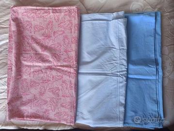 Vendo biancheria per lettino e culla: Lenzuola di Cotone (sopra 3 euro, sotto con angoli 3 euro, l'uno). Lenzuola di Flanella (Sopra 5 euro, sotto 5 euro, l'uno). Federe cuscini (2 euro, l'una) Copripiumini (7 euro, l'uno)