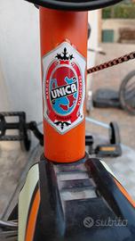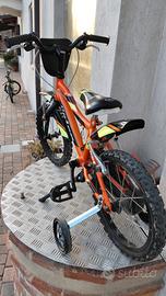 Bicicletta MTB marca Unica, modello Vortex 14 pollici, con rotelle e cavalletto, parafanghi anteriore e posteriore, colore arancione/nero/giallo.