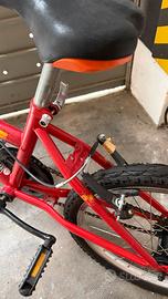 Bici Bambino 20 Pollici Rossa - buono Stato Vendo bicicletta da bambino/a con ruote da 20 pollici (misura copertone 20x1.75 come da foto), ideale per un'età indicativa tra i 6 e i 9 anni (altezza circa 115-130 cm). Caratteristiche: • Colore: Rosso vivace con forcella arancione. • Misura Ruote: 20" (pollici). • Telaio: Robusto, perfetto per imparare e divertirsi. • Condizioni: La bici è in ottimo stato generale, pulita e pronta all'uso. I copertoni sono in buone condizioni e presentano ancora un buon battistrada. Il cambio è un monomarcia (single speed), semplice e senza manutenzione. I freni (V-brake) funzionano correttamente. Note: Segnalo, per massima trasparenza, una leggera ossidazione superficiale su alcuni dadi e bulloni e qualche piccolo graffio da normale utilizzo, come visibile dalle foto, che non pregiudicano assolutamente il funzionamento. La sella è intatta. Prezzo: 40 €
