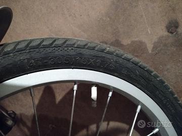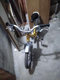 Bici bimbo/a come da foto, usata ma restaurata e ridipinta. Cavi freni, manopole e pedaline nuovi. Misura ruota come da foto (d. esterno 38 cm).