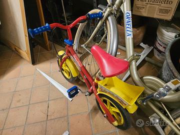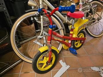 Bici vintage Fisher Price 1-3 anni. Nelle ruote non sono indicati i pollici in quanto sono molto piccole, completa di ruotini. La sella rigida presenta una crepa.