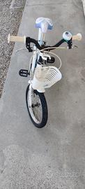 Bici per bambina stile Frozen usata ma ancora funzionante, con campanello, seggiolino e cestino, quest'ultimo con taglietto ma fa ancora il suo lavoro.