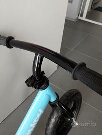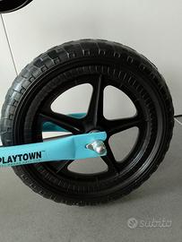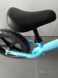 Bici senza pedali Grumpy Playtown, colore azzurro e nero, struttura in metallo robusta e resistente, ruote da 10 pollici, sella e manubrio regolabili in altezza, come nuova, provata un paio di volte in casa e poi in giardino, mai usata su asfalto, ruote perfette, non utilizzata perché mio figlio non è interessato