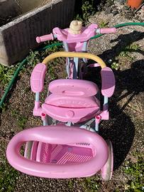 Bici/triciclo per bambina con possibilita’ di controllo sterzo da parte del genitore, dotata di protezione intorno al busto che puo’ essere anche sollevata. Completa di pupazzo sul davanti e porta pacchi postetiore. Ottime condizioni. Prezzo non trattabile