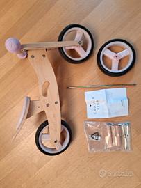 Bici triciclo trasformabile due e tre ruote, interamente in legno. Condizioni perfette, comprese istruzioni e pezzi aggiuntivi.
