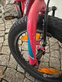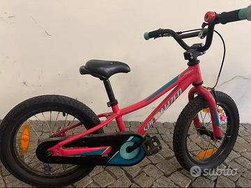 Vendo per cambio taglia bellissima bicicletta Specialized da bambina, colore fuxia e azzurro, raggio 16 con possibilità di montaggio rotelle. Usata pochissimo, solo un piccolo graffio presente in foto.