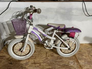 Bicicletta da bambina colore bianco von ruote da 14” con cestino anteriore , cuscino posteriore con borsa laterale.