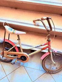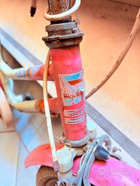 Vendo bicicletta da bambina marchiata Barbie modello Mattel, originale d’epoca, probabilmente prodotta tra fine anni ’80 e inizio ’90. Telaio in metallo color panna, con parafanghi rosa, grafiche originali Barbie e sella con motivo arcobaleno. Il manubrio alto e la struttura slanciata richiamano le bici stile chopper dell’epoca.