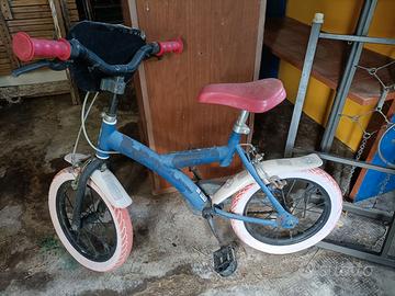 Bicicletta per bambini con telaio blu e manopole rosse.