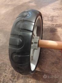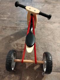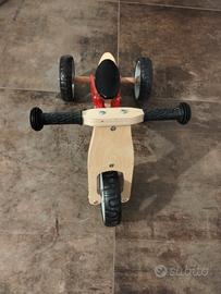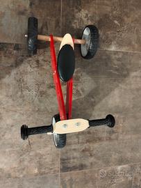 Bicicletta da bambino pedagogica a spinta Mini Bike realizzata tutta in legno colore rosso con ruota aggiuntiva che può essere montata dietro a realizzare così un triciclo.