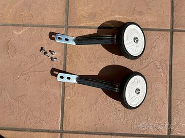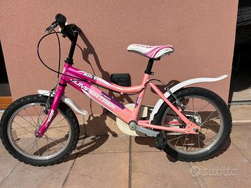 Bicicletta da bambina con rotelle in buone condizioni. La sella è rovinata in un punto e la copertura della catena non è perfettamente allineata (vd. Foto).