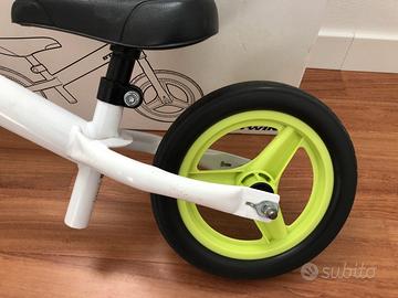 Bicicletta senza pedali Decatlhon Btwin. Cerchi verde fluo. Condizioni molto buone. Adatta da 2 a 4 anni, da 0,85 m a 1 m.