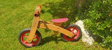 Vendo bicicletta in legno senza pedali con vari segni d'usura