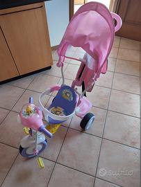 Triciclo con telaio in metallo, maniglione direzionale, cintura rigida di protezione, cruscottino con personaggio musicale, zainetto asportabile