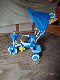 Triciclo con telaio in metallo, maniglione direzionale, cintura rigida di protezione, cruscottino con personaggio musicale.