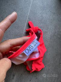 🔸 Modello 1 : bikini color corallo con top a fascia e graziosa balza traforata. Slip con volant a forma di petali, perfetto per il mare o la piscina.