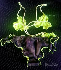 Bikini bimba, modello fascia con slip nodi regolabile in tessuto lycra a fantasia verde militare con contrasti giallo limone, arricciato sui bordi. Taglia 8 anni, vestibilità regolare.