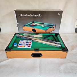 Vendo biliardo "Giocamondo", in legno da tavolo, misure 51x31x9.2 cm per bambini +5, comprese 2 stecche in legno, bocce, triangolo, gessetto, e spazzola per pulire il piano, tutto in perfetto stato
