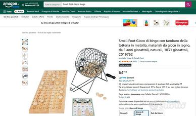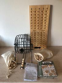 Vendo Bingo con cilindro mescolatore in metallo con manovella, tabellone da gioco pieghevole in legno che funge da porta palline, 24 diverse carte da gioco da riutilizzare, 75 palline di legno, piastre di copertura in legno.
