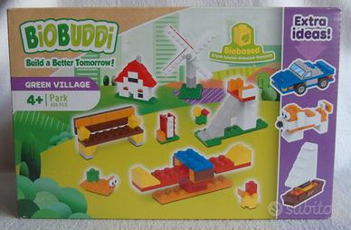 Set completo di costruzioni Biobuddi Green Village, 1004 mattoncini più la base di gioco più l'activity book "La città che vorrei" ricolmo di adesivi.