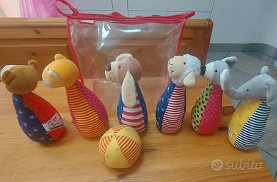 Divertenti e morbidi birilli-animali con pallina in stoffa colorata, nella loro confezione originale. Età consigliata a partire dai 18 mesi.