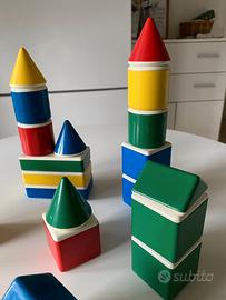 Primo gioco di costruzioni, con 24 elementi colorati, in cinque forme solide, facili da afferrare ed impilare.