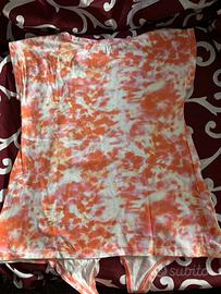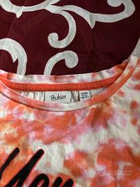 T-shirt fantasia salmone/rosa/bianco con scritta nera sul davanti. Scollo arrotondato e nodo sul fondo. Ottimo stato, praticamente non usata.