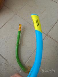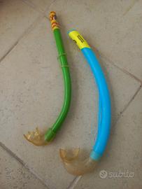Set di 2 boccagli per snorkeling, ideali per bambini. Uno è di colore verde con decorazioni colorate, l'altro è blu con dettagli gialli.