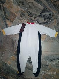 Vendo una tutina per bambino e bambina, a maniche lunghe e interamente in morbido cotone, colore bianco con decorazioni rosse e blu del settore automotive. Articolo ufficiale acquistato presso Scuderia Ferrari.