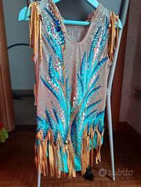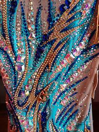 Splendido body per gara di ginnastica ritmica, arricchito da numerose pietre nei colori azzurro e dorato. Per bambine da 130-140cm di altezza ( 9 anni circa) . Dona un effetto davvero bello in pedana. Usato solo poche volte