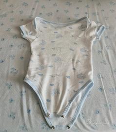 Morbido body per neonato, perfetto per tutti i giorni. - Colore bianco con simpatici orsetti azzurri. - Bordi azzurri. - Chiusura con bottoncini a pressione sul cavallo.
