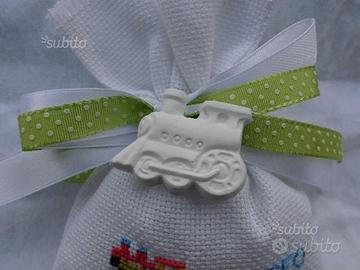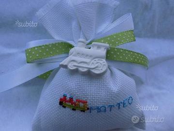 bomboniera creata e ricamata a mano chiusa con nastro a pois verde più nastro bianco di raso compresa di tulle e 5 confetti mandorla o cioccolato costo E 6,00 cad più gessetto profumato trenino costo 0,50 cent cad per info contattatemi!
