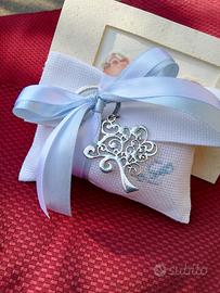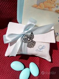 Bomboniera battesimo bimbo composta da busta o sacchettino bianchi con iniziale del nome ricamata a mano misure 12cm per 15 cm comprensiva di tulle 5 confetti mandorla o cioccolato della ditta crispo e bigliettino con nome e data più ciondolo in metallo argentato senza nickel o gessetto profuma biancheria... Per maggiori informazioni contattatemi!
