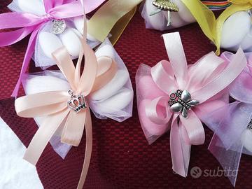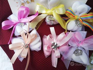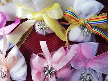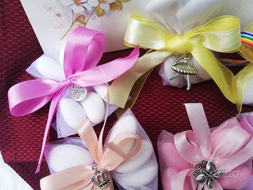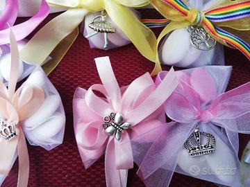 Bomboniere per bimba super economica contenente 5 confetti mandorla o cioccolato della ditta crispo e bigliettino con nome e data stampati più ciondolo, vari soggetti, in metallo argentato senza nickel costo bomboniera completa ?2,50 cad per info contattatemi!