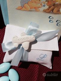 Bomboniere per battesimo bimbo composta da busta bianca con iniziale del nome ricamata a mano misure 12cm per 15 cm comprensiva di tulle 5 confetti mandorla o cioccolato della ditta crispo e bigliettino con nome e data più profuma biancheria a forma di mezzi di trasporto, costo bomboniera completa €5,50 cad per info contattatemi