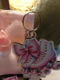 Bomboniera personalizzata, portachiavi a forma di pattini in legno,questo è solo un esempio. Insieme a bellissimo sacchettino porta confetti in raso rosa e dettagli floreali.