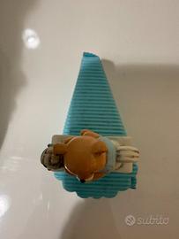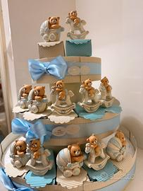 16 Deliziose bomboniere tema nascita/battesimo in stile dolce e raffinato, perfette per celebrare l’arrivo di un bimbo con un tocco di tenerezza. Il set comprende 16 pezzi assortiti, ciascuno composto da una scatolina decorativa con fiocco celeste e una figurina in resina dai dettagli curati: un orsetto in carrozzina e un orsetto sul cavalluccio a dondolo, entrambi nei toni crema e azzurro. All’interno di ogni bomboniera è presente un sacchettino con confetti celesti, già pronto per essere regalato. - quantità: 16 bomboniere totali - tema: nascita / battesimo maschietto - colori: crema e celeste - contenuto: sacchettino con confetti celesti gia incluso