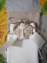 Vendo in blocco bomboniere per Prima Comunione e Cresima, 24 sacchettini neutri con 24 calamite in ceramica, 31 scatoline porta confetti, 126 bigliettini da scrivere. Nastro in raso e tulle li aggiungo in omaggio perché non sono molti.