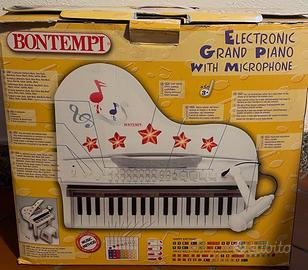 Vendo Bontempi electronic grand piano con microfono in perfetto condizioni. Pianoforte a coda elettronico a 37 tasti con microfono e sgabello, ritmi con arrangiamento, brani preregistrati, suoni di batteria e microfono con supporto regolabile