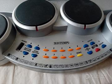 Bontempi, Modello Digital Drum Set DP0651. *incompleto, mancano le bacchette Presenta 4 pad per batteria con 12 strumenti ritmici percussivi. Include 8 suoni e 6 brani preregistrati. Offre 6 stili musicali (demosongs) e la possibilità di regolare la velocità. È un giocattolo vintage per bambini dai 6 anni in su.