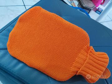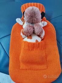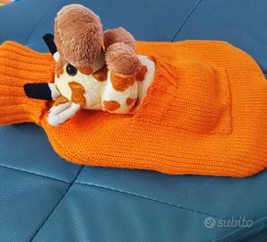 Borsa per l'acqua calda in tessuto arancione, con un simpatico peluche a forma di giraffa. - Peluche rimovibile. - Tessuto morbido e colorato. Leggera macchia sul taschino