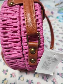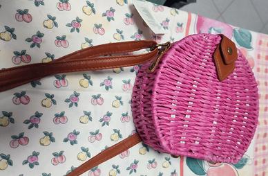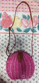 Borsa bambina fuxia con bretella regolabile. Carta e metallo, no brand.