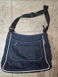 Vendo borsa a tracolla Peg Perego come da foto. colore blu scuro con rifiniture bianche. Come da foto di dettaglio i bordi bianchi da vicino si vede che sono un po' screpolati.