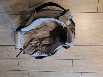 Borsa inglesina da appendere al passeggino. Estremamente capiente, è dotata di: Ampio scomparto interno con 4 tasche organiser Tasca posteriore espandibile Due tasche termiche laterali per biberon e pappe Una pochette staccabile tramite zip con due tasche esterne, uno scomparto interno con 2 ulteriori tasche e elastici per il fasciatoio Tappetino fasciatoio da viaggio Due gancetti per appenderla al passeggino Colore beige quindi neutro, adatto sia a maschio che a femmina. È stata usata ma non presenta segni di usura e le cerniere funzionano ancora perfettamente.