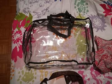 Una pochette foderata e fiorata( come la borsa grande) con tasca per biberon, una pochette marrone, una borsa grande in plastica antipioggia che contiene le altre tre.