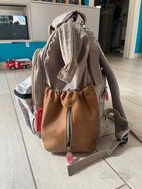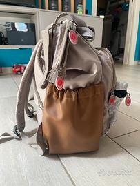 Ha un’apertura ampia e rigida per trovare tutto facilmente, doppia tasca frontale (una impermeabile, l’altra con porta biberon), tasche laterali (una per i fazzoletti), e tasca posteriore con zip.