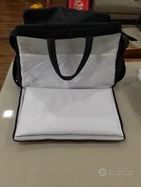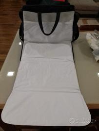 Spaziosa e moderna borsa da viaggio, in morbido tessuto e inserti in ecopelle con vari vani porta oggetti, tracolla e si può fissare a qualsiasi telaio o passeggino cosi da poterla portare ovunque