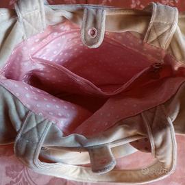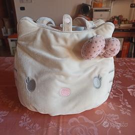 Borsa a forma di faccia del gatto Hallo Kitty di peluche con comoda doppia tasca interna e manici panna nello stesso tessuto.. Rivestimento interno rosa in stoffa. Versatile.. Porta pigiama o borsetta da bimba molto simpatica... Alta 26 cm Senza manici, 48 cm con i manici e larga cm 30.