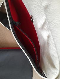 In pelle bianco avorio e dettagli neri, interno rosso.