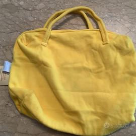 Allegra borsa giallo sole, con margheritona, realizzata in pile, due manici, chiusura a lampo.